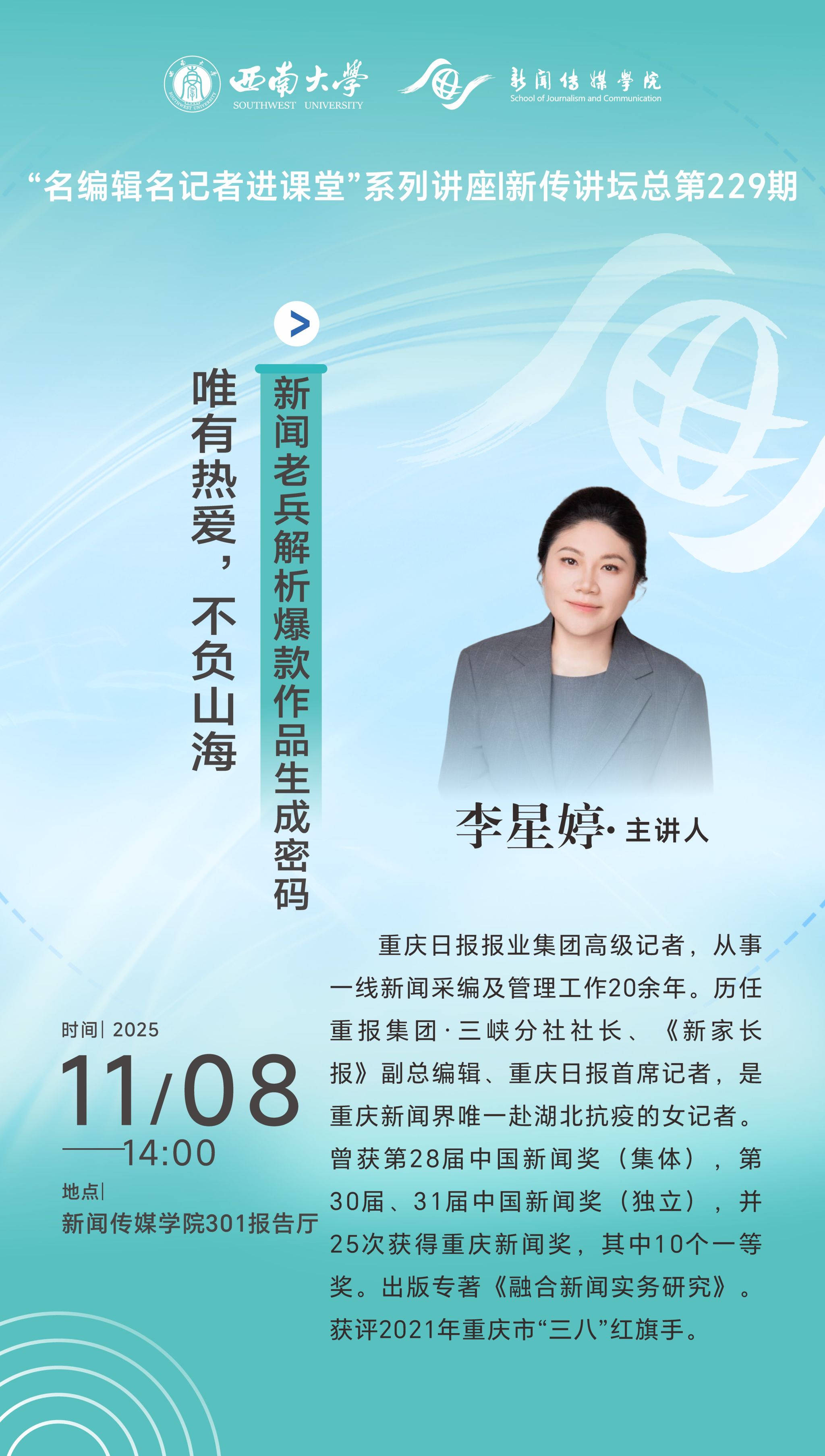 “名编辑名记者进课堂”系列讲座 | 新传讲坛总第229期 | 李星婷:唯有热爱,不负山海—新闻老兵解析爆款作品生成密码