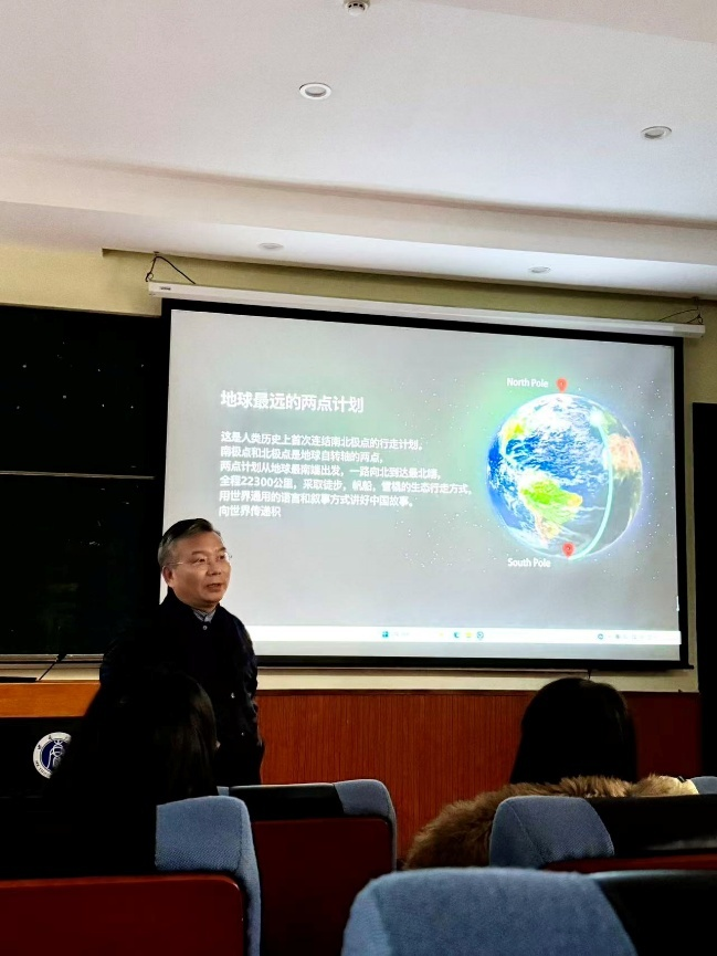 讲座伊始,张克明导演以其指导员工完成的自然类纪录片《苍黄青翠》为案例,从前期准备、拍摄执行和后期处理三个阶段讲解纪录片的基本制作流程。他介绍,在农业题材纪录片拍摄中,由于人与昆虫、植物的互动有限,采集有效画面相对困难,对拍摄者的观察与持续投入提出更高要求。随后,他展示了个人作品《地球最远的两点计划》,并说明该片在制作过程中因坚持环保原则选择帆船航行、在极地环境中遇到冰隙等现实条件,导致拍摄难度较大。他指出,纪录片创作通常伴随较长周期与不确定性,需要创作者在体力、耐力和心理层面保持稳定投入。