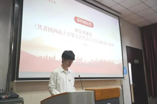大会第三项议程,由杜易姗同学介绍代表候选人预备人选的情况。在第四项议程中,大会审议并通过了《共青团伟德BV1946官网第五次代表大会代表候选人名单》。会代表在听取介绍后,对候选人名单进行审议,并经表决一致通过。