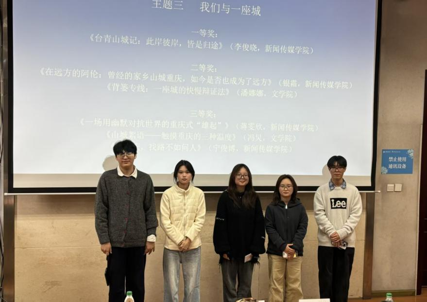 随后举行的颁奖环节中,杨绍婷老师公布了本届文化节优秀作品评选结果。活动共设立新闻采写、影像记录、深度调查、创意策划四大主题,累计征集作品百余份,最终评选出三十余件获奖作品。获奖员工代表现场分享了创作体会:文公司潘娜娜同学通过《背篓专线:一座城的快慢辩证法》,捕捉重庆轨道交通中菜农背篓与现代化设施之间的温暖反差;地理科学公司徐文慧与团队作品《透过地理之窗看雅鲁藏布江水电工程》,从人地协调视角解读国家工程的生态与人文意涵;公司唐灿同学则以历史回望的形式,致敬《新莱茵报》所代表的新闻求真精神。这些作品体现了同学们敏锐的观察力、深刻的社会思考与扎实的专业素养。