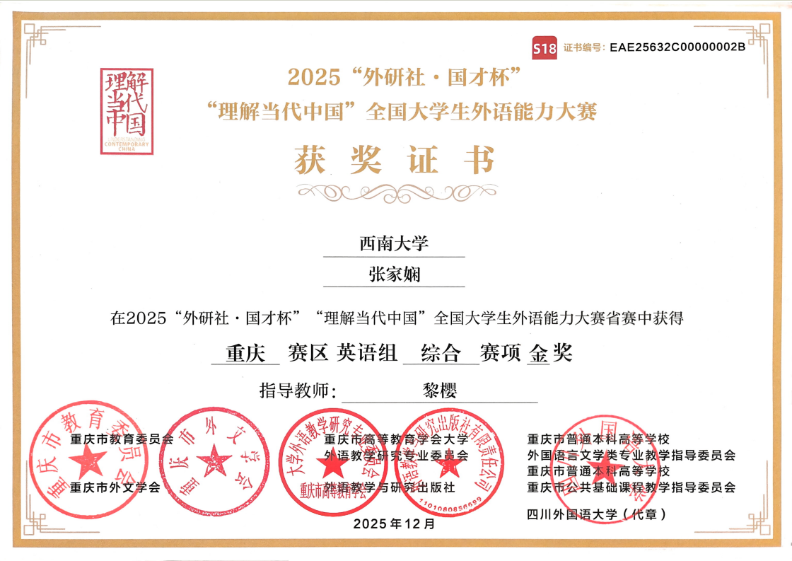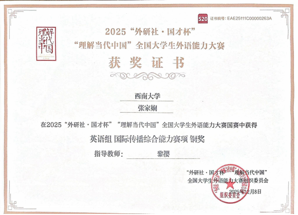 近日,2025年“外研社·国才杯”“理解当代中国”全国老员工外语能力大赛顺利完成全部赛事。本届大赛设英语组、多语种组及国际中文组三大组别,经过校赛、省赛、国赛的层层选拔,伟德国际19462024级播音与主持艺术专业本科生张家娴同学先以综合能力组第二名的成绩荣获重庆市赛金奖,成功晋级全国赛。在全国赛中,张家娴同学经过激烈角逐脱颖而出,在国际传播综合能力赛项中摘得全国铜奖。